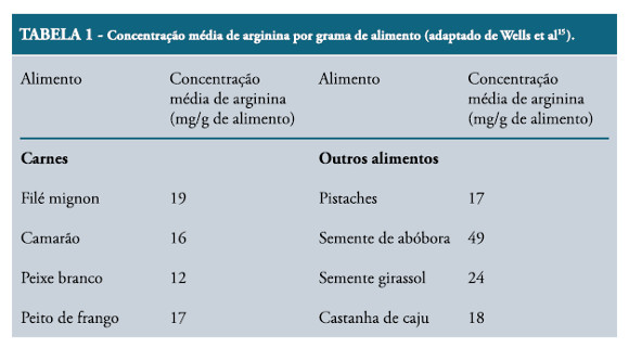 A L-arginina (ácido 2-amino-5-guanidino-pentanóico) é um aminoácido semi-essencial que tem várias funções metabólicas no organismo de mamíferos, participando dos processos de transporte e excreção do nitrogênio, síntese de uréia, síntese de proteínas e é o substrato para a síntese de creatina e NO13. As principais fontes de arginina livre são provenientes da dieta proteica, turnover de proteínas corporais e também pode ser sintetizada pelo organismo. Cerca de 40% da arginina consumida é metabolizada no intestino antes de atingir a circulação e aproximadamente 85% da arginina circulante é proveniente do turnover proteico14 . A Tabela 1 apresenta a concentração de arginina em alguns alimentos consumidos pela população mundial15 .