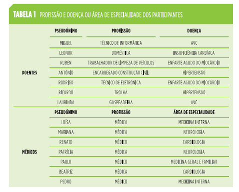 A qualidade teórico-metodológica e a exemplaridade foram os critérios usados na constituição desta amostra intencional.10 Na Tabela 1 descreve-se a profissão e a doença ou área de especialidade dos participantes, assim como o pseudónimo utilizado. As áreas de especialidade com maior relevância para as DCV foram escolhidas por dois médicos com experiência clínica e de investigação científica na área, os quais também selecionaram os participantes com experiência em DCV. Assegurou-se a diversidade de áreas de especialidade e uma variação de menos e mais de 10 anos de experiência profissional, entre os sete médicos entrevistados no grupo focal com profissionais de saúde. Garantiuse heterogeneidade de patologias cardiovasculares no grupo de doentes e excluíram-se aqueles com os melhores e os piores prognósticos, segundo a classificação dos médicos assistentes responsáveis por convidar os sete participantes.