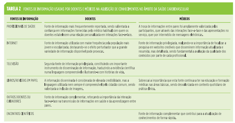 Doentes e médicos privilegiaram diferentes fontes de informação em saúde cardiovascular, emergindo em ambos os grupos a importância da confiança enquanto critério que preside a escolha. Os doentes valorizaram, por um lado, a informação transmitida pelo médico que os acompanha, assim como por outros profissionais de saúde e conhecidos a quem conferem credibilidade, e, por outro, o uso de linguagem acessível, oral ou escrita, preferencialmente acompanhada por imagens. Os médicos realçaram a informação proveniente de websites de instituições fidedignas de saúde, bem como a troca de informação entre pares, no local de trabalho ou em congressos e reuniões.