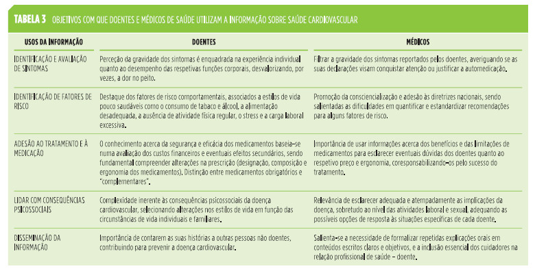 Doentes e médicos reportaram utilizar a informação sobre saúde cardiovascular para identificar sintomas e fatores de risco, conhecer a adesão ao tratamento, mais especificamente à medicação, e as consequências psicossociais da doença, distinguindo-se os dois grupos quanto às finalidades específicas e à hierarquização de prioridades. Os doentes usaram a informação sobretudo para compreender melhor as características e consequências da sua doença e as formas mais adequadas de a gerir quotidianamente, enquanto os médicos se centraram na importância de garantir que a informação é transmitida ao doente de forma clara e objetiva, de modo a coresponsabilizá-lo pelo sucesso do tratamento, salientando as dificuldades que encontram neste processo.