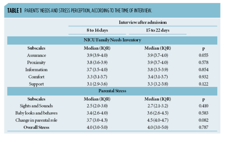 Thus, this study aims to assess the effect of data collection period on self-reported needs and stress among parents of very preterm infants hospitalized in NICU, by comparing those interviewed 8 to 14 days after childs admission with those interviewed 15 to 22 days after that event.