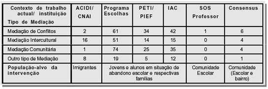 Estes dados podem ser complementados com os que apresentamos na tabela 1, e que indicam as frequências de resposta relativamente à população-alvo da intervenção dos mediadores com maior expressão nos diferentes contextos de trabalho, assim como o tipo de mediação privilegiado junto dessa população.