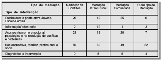 Com um mandato muito específico, para conciliarem os jovens alunos com a escola, os mediadores parecem ser actores essenciais nos contextos escolares. No domínio da sua intervenção recorrem, não só a diferentes tipos de mediação, como também a diferentes tipos de intervenção que evidenciam, precisamente, e na óptica dos inquiridos, a representação da mediação não apenas enquanto técnica específica e alternativa de resolução de conflitos, mas ainda enquanto estratégia comunicacional de gestão social, tal como podemos ler na tabela 2.