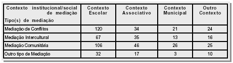 Apesar da mediação de conflitos ter bastante expressão, particularmente no contexto escolar, a mediação comunitária e intercultural parecem ser igualmente mobilizadas no âmbito da intervenção sociopedagógica dos mediadores, conforme sistematizamos na tabela 3.