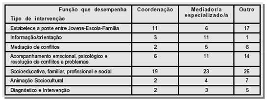 Esta diversidade de intervenções é assumida pelos diferentes mediadores, independentemente das funções que desempenham de coordenadores da equipa, mediadores especializados ou outro como se pode ver na tabela 4.