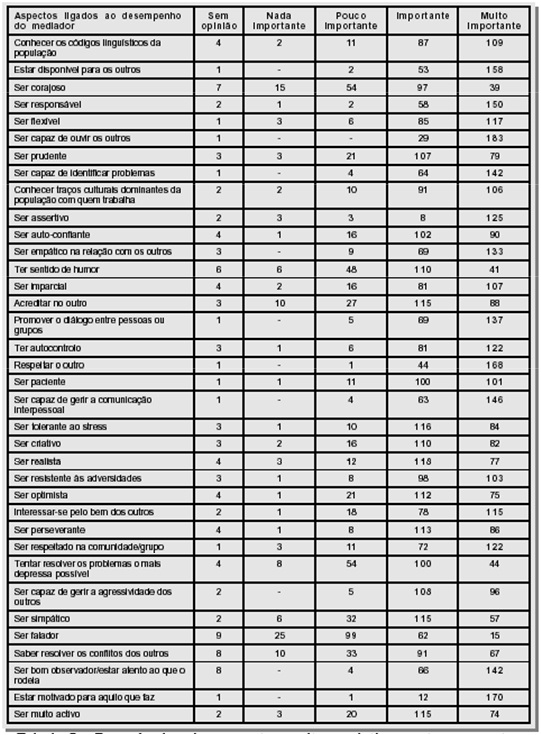 No questionário que serviu de base a este estudo, pretendemos ainda captar a valorização que os respondentes fazem de um conjunto de aspectos ligados ao desempenho dos mediadores. Para tal, apresentou-se um conjunto de itens, de resposta tipo likert (escala de 4 pontos, para além da resposta "sem opinião"), construídos a partir da revisão da literatura e também a partir da análise de entrevistas exploratórias a mediadores realizadas em estudos prévios (Freire e Caetano, 2008; Caetano e Freire, 2006). Na tabela 5, apresentamos os resultados obtidos, por item, considerando os pontos da escala (de importância).