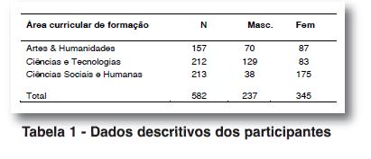 Participaram no estudo 582 alunos de uma universidade pública portuguesa. As áreas curriculares frequentadas eram Artes e Humanidades (AH) - cursos de Línguas e Literaturas, Estudos Portugueses e Lusófonos, Música, Arquitetura e Comunicação de Moda (27%); Ciências e Tecnologias (CT) - cursos de Matemática, Estatística, Física, Bioquímica e Engenharias (36%); e Ciências Sociais e Humanas (CSH) - cursos de Educação, Psicologia e Ciências da Comunicação (37%). Na amostra, 59% eram raparigas e 41% rapazes, sendo 63% alunos do 2º ano de licenciatura e 37% do 1º ano de mestrado. A média de idades é 23,4 anos, oscilando entre 18 e 59. Na Tabela 1 é indicada a caracterização dos participantes, tomando a área curricular e o género.