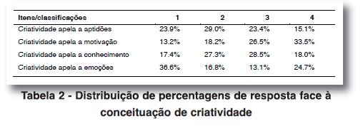 Começa-se por apresentar na Tabela 2 a distribuição de respostas em percentagens face à conceituação de criatividade a partir de quatro dimensões a avaliar. Verifica-se algumas ausências de resposta nestes itens.