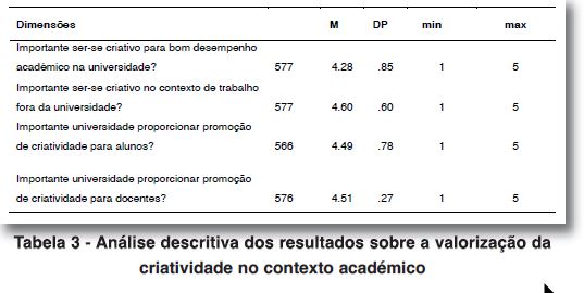 Após os dados sobre a conceituação de criatividade, apresentam-se os relativos à sua valorização. Tomando uma análise descritiva com recurso às médias (M), desvios-padrão (DP), valores mínimos e máximos, são apresentadas na Tabela 3 as perceções dos alunos sobre a importância/valorização de criatividade no contexto académico.