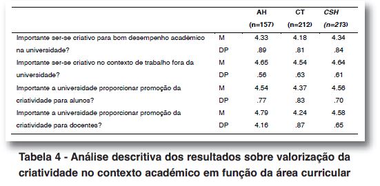 Assim, a maior valorização da criatividade no contexto académico pelas CSH face às CT parece compreensível, pensando que no primeiro caso os alunos lidarão mais frequentemente com divergência de opiniões, crítica ou perspetivação além da realidade quotidiana, sendo talvez implicada maior reflexão ou imaginação. No contexto universitário, e mesmo pré-universitário, propostas de trabalho como ensaios, debates, role-playings ou entrevistas serão mais frequentes nesta área (por exemplo, em Psicologia, Comunicação ou Educação) do que nas CT. Ora, tal tipo de tarefas explicita e facilita a expressão criativa (Edwards et al., 2007). Também uma maior abordagem académica de conteúdos como criatividade, inovação ou sobredotação podem reforçar uma maior valorização da criatividade. Alunos de CT serão talvez confrontados no quotidiano académico com uma resolução de problemas mais concreta e objetiva (e.g., problemas numéricos, mecânicos, laboratoriais), valorizando mais um pensamento convergente e não tanto a explicitação de competências criativas, as quais podem ainda necessitar de ser desmistificadas dada a sua relevância para a investigação científica e tecnologia (Wood & Bilsborow, 2014).
