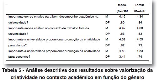 Apresenta-se agora a análise descritiva por género dos alunos na Tabela 5. Em todos os itens, ambos os géneros expressam grande valorização da criatividade (oscilação de valores entre 4.19 e 4.68). Note-se o desvio-padrão elevado na apreciação pelos rapazes da promoção face aos docentes, ilustrando grande dispersão de opiniões.