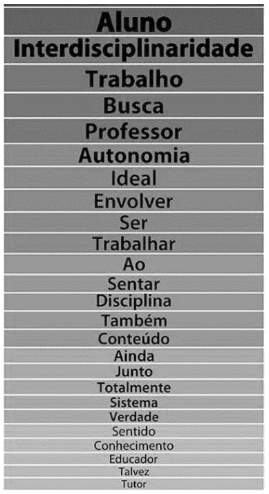 As reflexões dos docentes sobre interdisciplinaridade e práticas pedagógicas são compostas pelo agrupamento de 30,6% das falas totais dos professores nas entrevistas. A Figura 1 apresenta uma lista com as primeiras 25 palavras que compõem este tema, que foi gerada automaticamente pelo IRaMuTeQ e ordenada em função de uma métrica estatística (, qui-quadrado), que mede a força de associação da palavra com a classe. O tamanho da fonte utilizada nas palavras procura representar essa métrica.