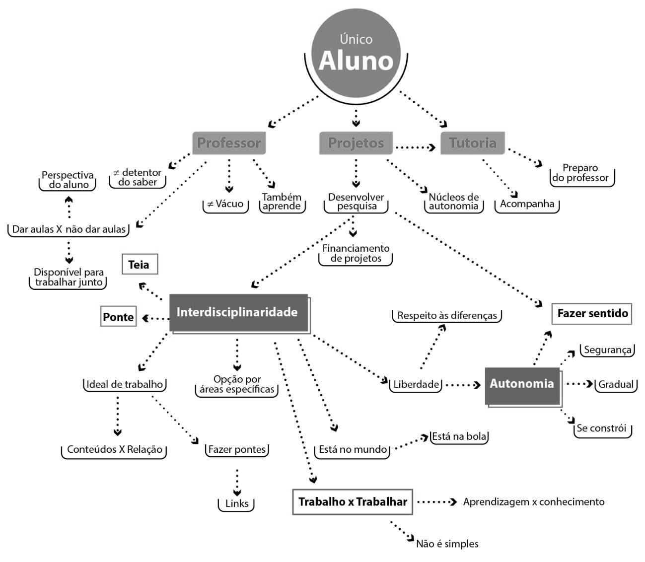 Estas narrativas, assim como a observação da escola, demonstraram a existência de um trabalho intenso, por parte da escola, na busca por uma valorização da relação entre professor e aluno, juntamente com a relação de ambos com o conhecimento. As falas dos professores demonstraram a importância do entendimento da unicidade do aluno e do trabalho minucioso do professor enquanto profissional responsável por conhecer e ajudá-lo em seu processo de busca pelo conhecimento. Nesse sentido, a construção de uma autonomia gradativa, levando em conta o momento de transição do entendimento dos conhecimentos isolados para o entendimento do conhecimento de forma interdisciplinar permite uma complexa articulação na construção de redes de saber.