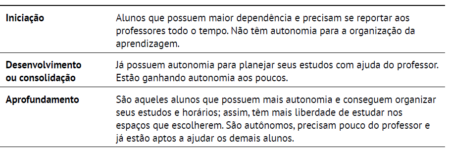 No ano de 2013 a escola adotou o trabalho com os Núcleos de Autonomia, como disposto no Projeto Político-Pedagógico. Os alunos são divididos de acordo com o grau de autonomia e aprendizagem que apresentam. Quando ingressam na escola, independentemente de sua idade, todos estão no nível Iniciação. Conforme vão demonstrando sua capacidade, vão sendo direcionados aos demais grupos. O Quadro 1 apresenta a descrição do que caracteriza cada um dos Núcleos de Autonomia: