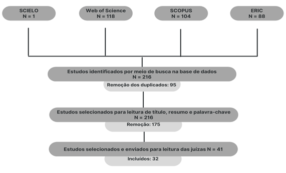 Descrição: primeira linha, há pequenos quadrados; no primeiro, SciELO N=1; no segundo, Web Of Science N=118; no terceiro, Scopus N=104; no último, ERIC N=88. De cada quadrado sai uma linha até o centro em um quadrado maior, lê-se “Estudos identificados por meio de busca de dados N=216” abaixo, lê-se “Remoção dos duplicados: 95”. Abaixo, a linha continua para o próximo quadrado, lê-se “Estudos selecionados para leitura de título, resumo e palavra-chave N=216” abaixo, “Remoção: 175”. A última linha leva ao último quadrado abaixo, lê-se “Estudos selecionados e enviados para leitura das juízas N41”, por fim, “Incluídos: 32”. [Fim]