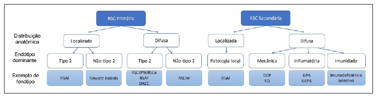 No que diz respeito à classificação da RSC, esta também pode ser dividida, de uma forma mais útil para a prática clínica, em primária ou secundária (Figura 1) e, em cada uma destas divisões, em localizada ou difusa, tendo em conta a sua distribuição anatómica. Na RSC primária a patologia é dividida de acordo com o endótipo dominante - tipo 2 (caracterizado por uma inflamação tipo 2 em que existe maior ativação e recrutamento de eosinófilos e mastócitos) e não tipo 24. Esta classificação por endótipos (RSC tipo 2 vs não tipo 2) torna‑se útil sobretudo pelo interesse prognóstico. Sabe‑se que doentes com o endótipo tipo 2 tendem a ser mais resistentes à terapêutica instituída, demonstrando maior taxa de recorrência da doença, quando comparados com doentes com o endótipo não tipo 2. A RSC primária localizada subdivide‑se em dois fenótipos - rinossinusite alérgica fúngica (tipo 2) ou sinusite isolada (não tipo 2). No caso da RSC difusa, os fenótipos clínicos são determinados de acordo com a quantificação histológica do número de eosinófilos (>10 por campo de grande ampliação - RSC eosinofílica). Por outro lado, no caso da RSC secundária a subdivisão é feita de acordo com quatro categorias dependentes da patologia local (no caso da localizada, odontogénica, bola fúngica ou tumor), fatores mecânicos (DCP, FQ), inflamatórios (granulomatose eosinofílica com poliangeíte e granulomatose com poliangeíte) e imunológicos (imunodeficiência seletiva)4.