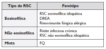 clínica e o prognóstico da RSC. Dessa forma, a RSC pode ser classificada em eosinofílica, não eosinofílica e mista (Tabela 2)(14). Assim, existem várias patologias que podem ser consideradas como subfenótipos da RSCcPN, nomeadamente doença respiratória exacerbada pela aspirina (DREA), fibrose quística (FQ), discinesia ciliar primária (DCP) e rinossinusite fúngica alérgica14.