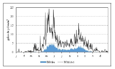 Analisou-se o número de dias e as respetivas datas em que a concentração média diária foi superior a 10 grãos de pólen/m3, valor limiar referido pelos investigadores Feo Brito et al.19 a partir do qual se podem desencadear sintomas de alergia em indivíduos com alergia a este tipo de pólen.