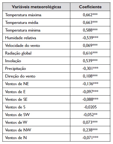 Tabela 3 Coeficientes de correlação de Spearman entre as concentrações médias diárias do pólen atmosférico de Amaranthaceae e os parâmetros meteorológicos (2002-2019).