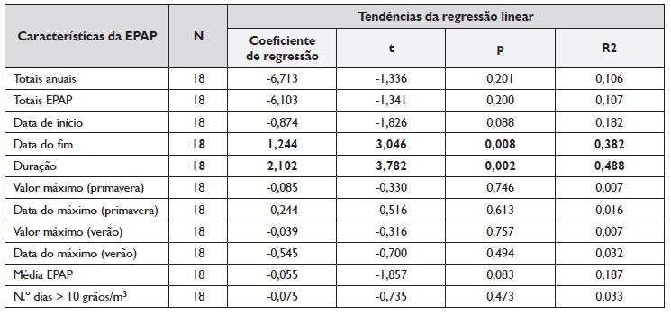 As concentrações médias diárias superiores a 10 grãos/m3 registaram-se em maio, início de junho, agosto e setembro (primavera e verão), maioritariamente em maio (primavera) (Tabela 4). Pela análise de regressão linear (Tabela 5) há a salientar que ao longo dos anos de estudo se verificou uma tendência estatisticamente significativa (p<0,05) para o aumento da duração da estação polínica, com datas de término mais tardias. Para as restantes características da estação polínica as tendências observadas não foram estatisticamente significativas (p>0,05).