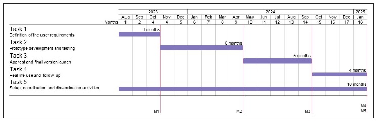 This protocol is based on a co-design technology development approach. This approach is iterative, involving multidisciplinary teams and incorporating user engagement as part of the design, testing, and implementation process. Telemedicine companies will also be invited to participate in the app development to foster its integration into clinical practice. Regular interactions between patients, developers and healthcare professionals will be a priority for user requirements definition (task 1) and iterative development and testing until the app’s final version (tasks 2 and 3). Patients/carers and healthcare professionals will be fully engaged in the real-life use study (task 4) and management and dissemination activities (task 5). The tasks and respective milestones schedule to be developed in the eighteen months of the project are presented in Figure 1.