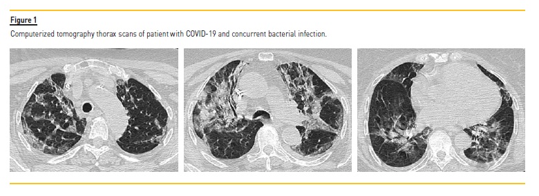 In this case, chest CT documented diffuse involvement by COVID 19 and aspects suggestive of bacterial infection (Figure 1).