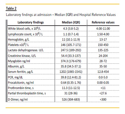 Table I and Table II summarize clinical manifestations and laboratory findings, respectively. The median interval between the onset of symptoms and the first positive test was 2 (0.15‑3) days. The main symptom was dry cough (64%), followed by fever (36%), dyspnoea and fatigue (29%). Only 1 patient had diarrhea and no patient registered any other gastrointestinal manifestations, namely abdominal pain or vomiting. No patient was completely asymptomatic. At the time of admission, most patients (79%) had leukopenia (defined by leukocyte count less than 1500) and 50% of patients had thrombocytopenia (defined by platelets count less than 150000). Increased LDH and inflammatory markers, including CRP, procalcitonin and ferritin levels was observed. Plus, high prothrombin and partial thromboplastin time were registered.