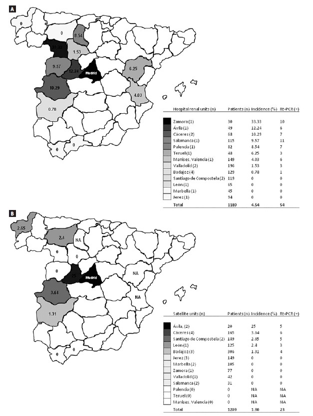 No case was detected in units in Marbella or Jerez de la Frontera, but reached 15.9% in units in Ávila. (Table I and Figure 1). There were 19 hospital and 21 satellite units included in the study, where 1,189 (49.6%) and 1,209 (51.4%) patients were dialyzed, respectively. The incidence of COVID-19 in the hospital units (Figure 2a) was significantly higher (p = 0.0003) than the incidence observed in the satellite units (Figure 2b): 4.5% and 1.9% respectively.
