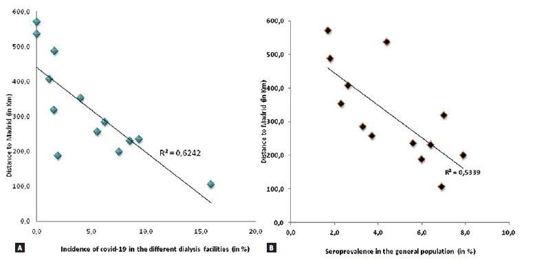 Figure 3 Correlation between the incidence of COVID-19 and the distance to Madrid from the dialysis facilities (Fig. 3a) and correlation between the seroprevalence in the general population (in each province) and the distance to Madrid (Fig. 3b)