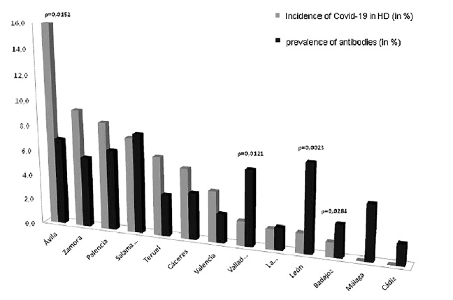 Finally, no clear relationship was observed between the percentage of seroprevalence in the general population3 and the COVID-19 incidence in its HD units. Thus, there were provinces such as León, Valladolid or Badajoz, with a significantly lower COVID-19 incidence in their HD units compared to their general population seroprevalence (p <0.05; Fisher exact test). This phenomenon was even more evident in cities such as Marbella (Málaga) or Jerez de la Frontera (Cádiz), where no positive cases were reported in their HD units. On the contrary, there were provinces such as Zamora, Palencia, Teruel, Cáceres or Valencia, where COVID-19 incidence in their HD units was higher than the percentage of seroprevalence in their general population. This difference was particularly high in the province of Ávila (Figure 4).