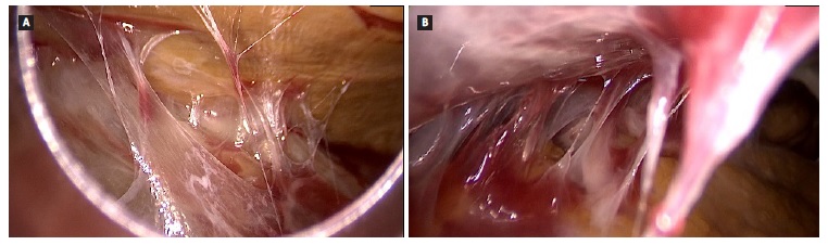 Figure 2 Findings during enterolysis. Multiple intra-abdominal adhesions of bowel loops by cobweb-like sclerotic membranes.