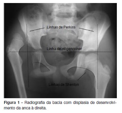 Após os quatro a seis meses deve ser pedida a radiografia da bacia, em incidência ântero-posterior, com as ancas em posição neutra.9,11,17 Para a sua interpretação podem ser úteis as linhas de Perkins (linha vertical traçada no bordo externo do acetábulo) e Hilgenreiner (linha horizontal traçada através do centro de cartilagem trirradiada) (Figura 1).9,17 A interseção destas três linhas define quatro quadrantes e o núcleo de ossificação da cabeça do fémur encontra-se normalmente localizado no quadrante ínfero-interno.1,17 O índice acetabular é definido pelo ângulo formado pela junção da linha de Hilgenreiner e de uma linha traçada ao longo da superfície do acetábulo.1 O limite superior do normal são 27 graus.18 Os achados compatíveis com DDA incluem: núcleos de ossificação femural posicionados no quadrante súpero-externo, aumento do índice acetabular e atraso na ossificação do núcleo do lado envolvido.11 No caso do núcleo de ossificação femural não ser ainda visível, a linha de Shenton (que segue do colo do fémur até ao púbis) pode ser útil. Nos casos de DDA, esta linha está interrompida.9,17