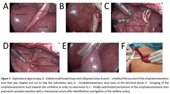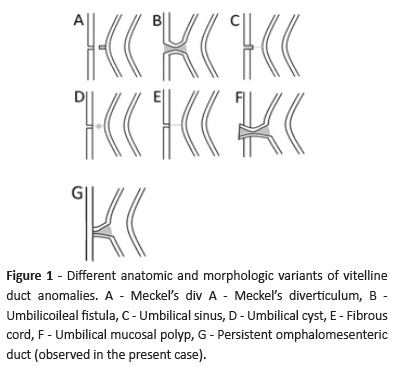 Clinical presentation is age-dependent and unspecific. Possible symptoms include irritability, umbilical discharge, umbilical hernia, emesis, abdominal pain, gastrointestinal bleeding, and absence of intestinal transit. Initial laboratory tests may be normal or show elevated inflammatory parameters. Abdominal radiography and ultrasonography are unspecific. Abdominal computed tomography may occasionally evidence the presence of a fibrotic band connecting the umbilicus to the small intestine. In this case, an abdominal computed tomography was not performed because the patient presented with an acute abdomen and such exam would delay treatment. Diagnosis was only possible through surgical exploration. Surgical excision of the vitelline duct anomaly is considered therapeutic.
