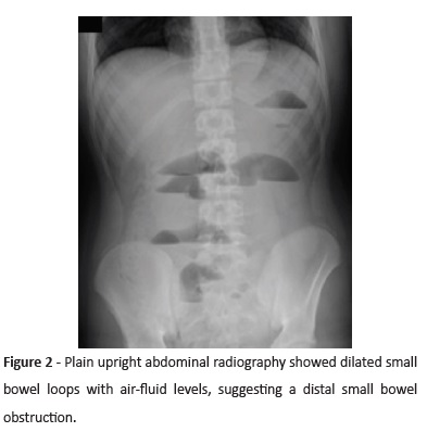 treatment but required hospitalization, and no previous history of abdominal surgery. No family history of gastrointestinal or other diseases was reported. The boy presented at the Emergency Room with a four-hour history of cramping abdominal pain and emesis (initially bilious emesis but later coffee-ground material), and no further complaints. Intestinal transit was present but decreased. He denied prior trauma and drug or toxic consumption. On examination, abdominal distension, decreased bowel sounds with normal tone, diffuse painful palpation, and mild signs of peritoneal irritation were noted. The remaining physical examination was unremarkable. Plain upright abdominal radiography revealed dilated small bowel loops with air-fluid levels, suggesting a small bowel obstruction (Figure 2). The boy started oral intake restriction and a nasogastric tube drain was placed. Laboratory tests revealed mild leukocytosis (23.9 x 103/µL leukocytes, with 19.9 x 103/µL neutrophils) and negative C-Reactive Protein (<2.90 mg/L). Digestive endoscopy identified no hemorrhagic injury or other changes. An exploratory laparoscopy was performed, which revealed distension of small intestine loops but no macroscopic signs of ischemia. Cecum was normally placed in the lower right quadrant and the colon loops were collapsed. A tubular structure with macroscopic appearance, similar to the small intestine (not just a fibrotic band), was found connecting the antimesenteric border of the terminal ileum to the umbilicus, which was behaving as a rotation axis for the small intestine (Figure 3). The umbilical border was ligated with 2 XL hemolocks, and the volvulus laparoscopically de-rotated. The structure was brought extracelomically and resected with a GIA 55 after ligation of the vitelin artery. Histological examination confirmed the diagnosis of persistent OMD. The post-operative period was uneventful, and the boy was successfully discharged on the fifth postoperative day. He remained asymptomatic over a six-month follow-up period.