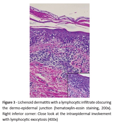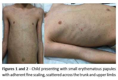 A previously healthy nine-year-old male presented with a two-week history of disseminated asymptomatic dermatosis with numerous small erythematous fine-scaling papules on the trunk and limbs, with no apparent trigger (Figures 1 and 2). Examination was otherwise unremarkable. Histopathological exam revealed interface dermatitis with moderate-to-intense perivascular and periadnexal lymphocytic infiltrate, with epidermal exocytosis, obscuring the dermo-epidermal junction (Figure 3).