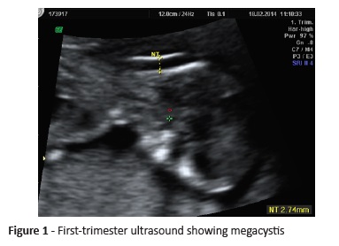 A pregnant woman with no relevant family or personal medical history was referred to our Hospital for first-trimester combined screening. US revealed a single fetus with 12 weeks and six days. Increased nuchal translucency (NT >95 percentile), megacystis, and SUA were detected. Chorionic villus sampling (CVS) was performed, with normal male karyotype result (46, XY).