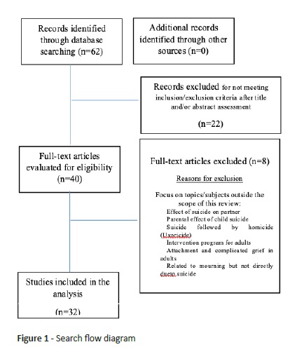 A literature review was conducted on PubMed database in March 2018 using the following MeSH terms: “bereavement” AND “suicide” AND “parental death” AND (“adolescent” OR “child” OR “infant” OR “ child, preschool”). Articles were selected according to the following criteria: a) population: children or adolescents at the time of exposure; b) exposure: death of a primary caregiver by suicide; c) outcome: grieving process difficulties and psychopathology throughout development and into adulthood. Studies were excluded if not meeting inclusion criteria, diverging from study purpose, not written in English or Portuguese, or article’s full text could not be retrieved online. When the decision for study inclusion or exclusion could not be made based on title and abstract reading only, article’s full text was read to ensure a better decision.