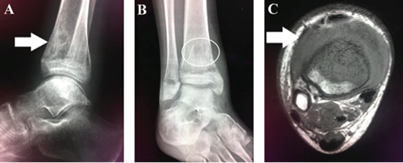 Figure IA X-ray of the right ankle on lateral view showing a mixed lesion with sclerotic and lytic areas in the anterior aspect of the distal tibia metaphysis (white arrow). Figure IB - X-ray of the right ankle on anteroposterior view showing a mixed lesion with sclerotic and lytic areas in the distal tibia metaphysis (white circle). Figure IC - MRI of the right ankle on axial T1-weighted imaging showings an infiltrative low-signal lesion located in the anterior aspect of the distal tibia metaphysis and extraosseous extension, with adjacent soft tissue edema (white arrow).