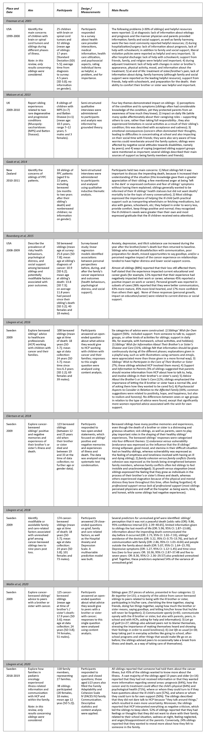 Five of the nine studies included in this review focused on the bereavement stage. However, as previously described, PPC encompasses a far broader and earlier approach than solely bereavement support. (1 Therefore, future research should focus on the needs and concerns of siblings in PPC using an earlier and longitudinal assessment. It should also be noted that the exclusion of studies in which participants were not the siblings themselves, although informed by evidence showing that siblings’ own perspectives provide beneficial augmentation to proxy reports, (2 may have omitted research articles concerning younger siblings - a population that requires special attention and care.