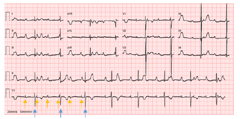 Figure 1 Neonatal complete atrioventricular block, with auricular rate of 100 bpm and ventricular rate of 49 bpm with p waves (yellow arrows) dissociated from QRS complexes (blue arrows)