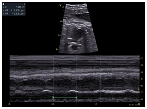 Figure 2 Fetal echocardiogram showing complete atrioventricular block, with auricular rate of 113 bpm and ventricular rate of 46 bpm