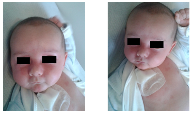 Cutaneous manifestations are present in approximately 40% of NLE cases.3 Although eruptions are characteristic, they are sometimes misdiagnosed as birth trauma, fungal infection, or eczema, especially in newborns from asymptomatic mothers.24 Lesions are usually not apparent at birth and develop after the first three months of life, mostly following sunlight exposure.3,4 The cutaneous hallmark of NLE is a superficial inflammatory rash affecting the upper eyelids, especially the periocular area, inducing the characteristic “eye mask” or “raccoon-like” appearance. The neck, perioral, zygomatic and temporal areas, and less frequently, the trunk or extremities may be involved (Figure 3).3,25 It usually presents as macular annular or elliptic erythema, but plaque-like lesions may also be observed. Borders are regular and sometimes raised, and central clearing is observed in about 30% of cases. Lesions usually have 1 cm in diameter but may coalesce and form larger erythematous areas.4,25 Severely affected areas may sometimes blister or crust. Persistence of telangiectasias, hyperpigmented skin areas, and skin atrophy have been reported in about 20% of cases.4 Although usually not required, histologic examination commonly reveals interface dermatitis, with granular deposition of immunoglobulin G at the dermo-epidermal junction.4 Despite this, some case reports have described typical annular erythematous macules or plaques with interstitial infiltration of mononuclear cells mixed with segmented neutrophils.26,27 These cases indicate that NLE should be included in the differential diagnosis of histiocytoid neutrophilic dermatitis and neutrophilic dermatitis,26,27 as well as other cutaneous lesions, like atopic dermatitis, seborrheic dermatitis, tinea capitis, eyelid telangiectasias, erythema multiforme, and familial annular erythema.3,28