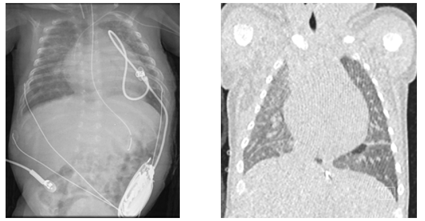 Figure 4 Pulmonary involvement with multiple focus of neonatal lupus pneumonitis depicted on chest radiography (left) and computed tomography (right)