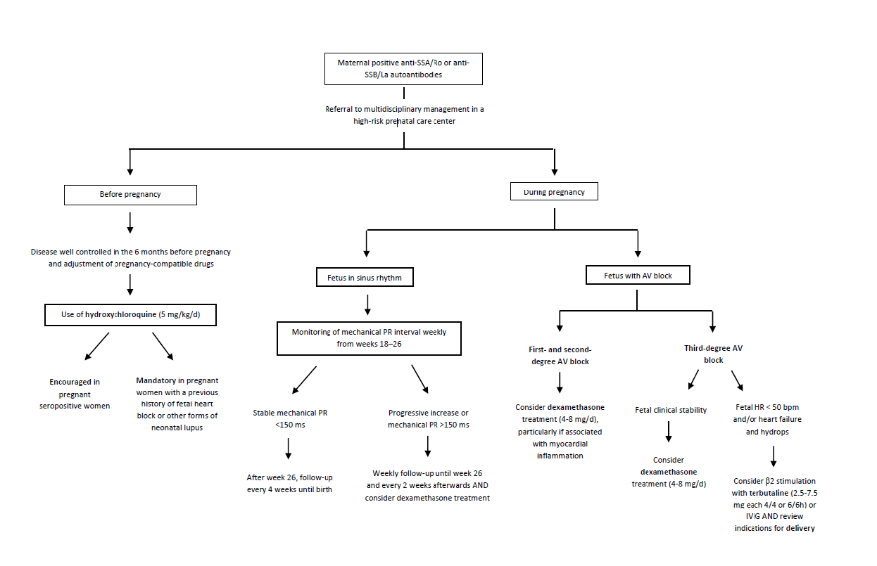 Pregnant women who test positive for anti-SSA/Ro or anti-SSB/La autoantibodies are considered to have a risk pregnancy.4,22 The increased risk period for the development of fetal heart injury is between 18 and 26 weeks of pregnancy and it can be detected by fetal echocardiography.18 This is a safe and non-invasive method for assessment of cardiac structure and rhythm and should be provided prenatally if the mother tests positive for specific antibodies.3,19,35 If maternal autoantibodies are positive and the fetus is in sinus heart rhythm, weekly measurements of the AV interval (mechanical PR interval) are recommended from 18 weeks onwards. If mechanical PR remains stable below 150 ms after week 26 - and given the rarity of de novo heart block after this stage - the current recommendations are for myocardial function monitoring every four weeks from week 26 until delivery.20,36 Conversely, if a progressive mechanical PR increase over 150 ms is noted from week 18, weekly follow-up until week 26 and every two weeks afterwards is recommended.18,20 Although controversial, treatment with dexamethasone at a dose of 4-8 mg orally can be started in cases in which AV interval is >150 ms or progressively increasing.20