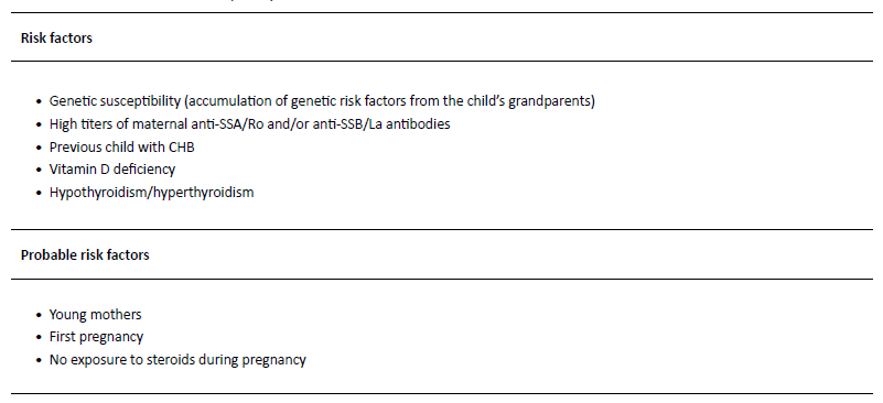 Despite the acknowledgment that NLE onset is related to the transplacental passage of maternal auto-antibodies, 1-3 the pathophysiology of the disease is not yet fully understood.3 In fact, two non-mutually exclusive mechanisms resulting in atrioventricular (AV) block have been proposed. According to one, the physiological process of apoptosis during fetal development results in the expression of intracellular antigens (Ro52 and Ro60) on the surface of fetal cells, particularly cardiac cells.4,10,11 In the second trimester, maternal anti-SSA/Ro and anti-SSB/La antibodies start to cross the placenta, and the antigen-antibody complex is then opsonized and phagocytized, triggering a proinflammatory process with subsequent fibrosis and tissue damage, particularly on the AV node and surrounding tissues.4,10,11 The second hypothesis is based on mimicry, whereby autoantibodies target and cross-react with L-type calcium channels. This could cause an imbalance of calcium homeostasis and fetal heart rhythm disturbances.3,4,10,12-14 While the interaction between maternal autoantibodies and fetal antigens seems crucial, 98% of children exposed to those antibodies are healthy.3 This suggests that additional factors are likely to play a role in the pathogenesis of the disease (Table 1).3,10,11,15,16