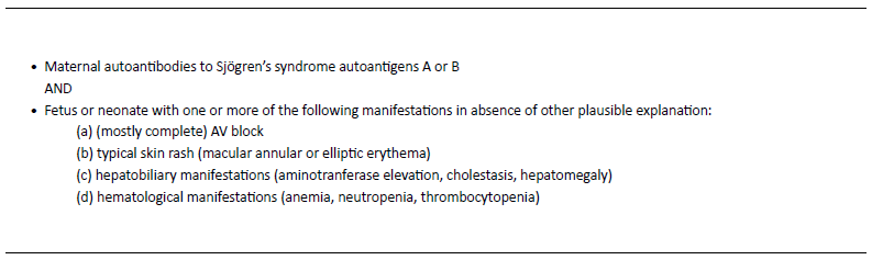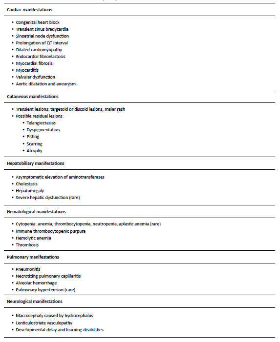 The clinical features of NLE include both reversible and irreversible manifestations.5 Reversible manifestations, like cutaneous lesions, hematological and pulmonary abnormalities, and hepatobiliary dysfunction, disappear spontaneously as the levels of autoantibodies decrease in the bloodstream, generally in the first 6─8 months of age.2,5,17 About 2% of children develop irreversible and potentially life-threatening manifestations, including disturbances of the cardiac stimulatory and conduction systems.2-5 Cardiac manifestations are the only ones that can be detected in the prenatal period. Because of this, NLE diagnosis is established when the mother has anti-SSA/Ro or anti-SSB/La autoantibodies, and the fetus or neonate develops (mostly complete) AV block, or when the neonate develops the typical skin rash or hepatobiliary or hematological manifestations in the absence of other plausible explanations (Table 2).4 Table 3 summarizes the clinical manifestations of NLE.