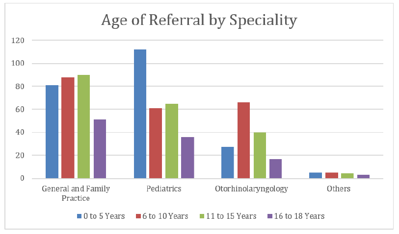 A total of 751 children were included in this study, 52.5% (n=394) of whom male, with a median age of nine years (P25 5 years−P75 13 years). The 0−5-year age group was the most frequently referred to consultation (Figure 1). Patients were referred to ACI OC by general practitioners (GP), pediatricians, and otorhinolaryngologists (ENT), among other specialists.