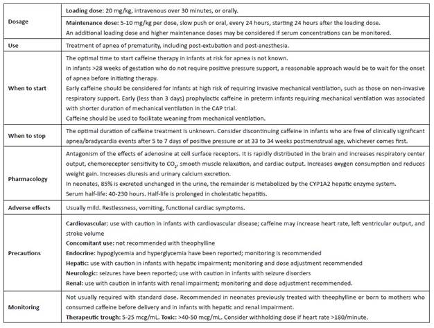 Monitoring of plasma caffeine levels does not appear to be necessary with standard dosing regimens, but may be useful when higher than standard doses are used and in the presence of renal or hepatic impairment.10,34 The role of therapeutic drug monitoring needs to be addressed.35 It is recommended in neonates previously treated with theophylline or born to mothers who consumed caffeine prior to delivery.10