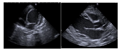 Figure 1 Transthoracic echocardiogram (apical and parasternal long-axis views) showing cardiomegaly and left ventricle dilation.