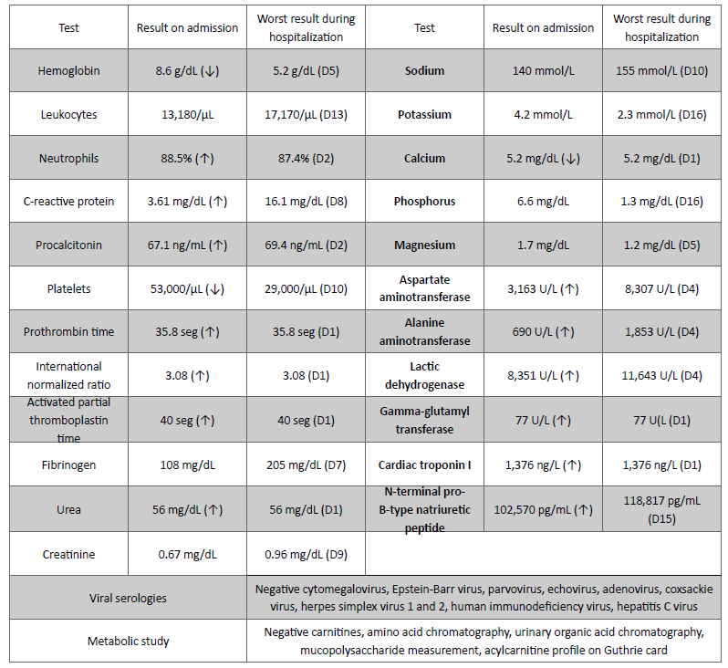 On admission to the ED of a secondary hospital, she was poorly reactive, with an immeasurable peripheral oxygen saturation (SpO2) and poor peripheral perfusion. Physical examination revealed scattered crackles on lung auscultation, palpable hepatomegaly four centimeters below the right costal margin, and peripheral edema. Chest radiograph showed bilateral diffuse hypotransparency and exuberant cardiomegaly. Capillary blood gas analysis revealed severe acidosis with pH 6.94, partial pressure of carbon dioxide (pCO2) 56 mmHg, bicarbonate (HCO3) 12.2 mmol/L, calcium (Ca2+) 0.72 mmol/L, and lactate 10.6 mmol/L. Analytical evaluation of cardiac function revealed elevated cardiac enzymes, with cardiac troponin I (cTnI) 1627.6 pg/mL, creatine kinase-myocardial band (CK-MB) 223.9 U/L, and N-terminal pro-B-type natriuretic peptide (NT-proBNP) 102570 pg/mL. The remainder of the laboratory study revealed hemoglobin (Hb) 9.9 g/dL, leukocytes 9,600/µL with 10.4% neutrophils and 83.0% lymphocytes, platelets 399,000/µL, and C-reactive protein (CRP) <3 mg/L.